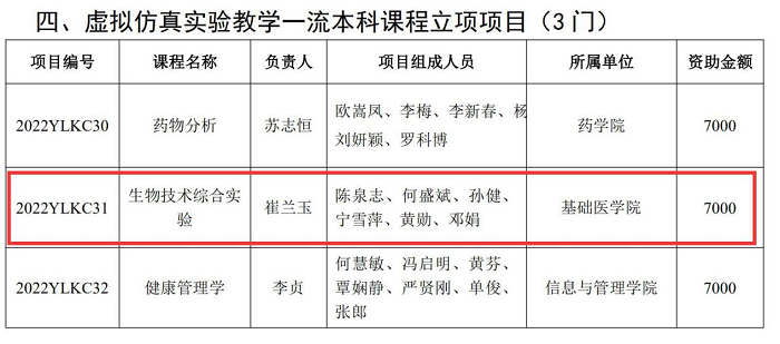 近日,学校公布了2022年广西医科大学一流本科课程立项项目的名单,我院《生物技术综合实验》入选虚拟仿真实验教学一流本科课程立项项目。特此对入选团队表示热烈祝贺!学院将继续以建设具有高阶性、创新性、挑战度的“金课”为发展目标,坚持立德树人,凝心聚力,砥砺前行,坚定不移推进一流本科课程建设。