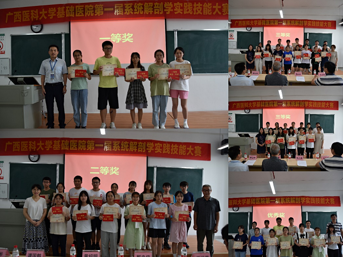 2022年6月11日,由基础医学院主办,人体解剖学教研室承办的广西医科大学基础医学院第一届系统解剖学实践技能大赛圆满落下帷幕。经过激烈的角逐,在1260名参赛选手中最终评出一等奖5名、二等奖15名、三等奖30名、优秀奖55名。2022年6月13号下午,学院在武鸣校区A2栋5楼解剖学实验室举行了本次大赛的颁奖典礼,谭国鹤院长、罗彬副院长、教研科科长郭忠信及人体解剖学教研室黄绍明主任、邓琼英副主任、人体解剖学教研室党支部磨洁琳书记、玉洪荣副书记出席此次颁奖典礼。颁奖典礼由磨洁琳书记主持。