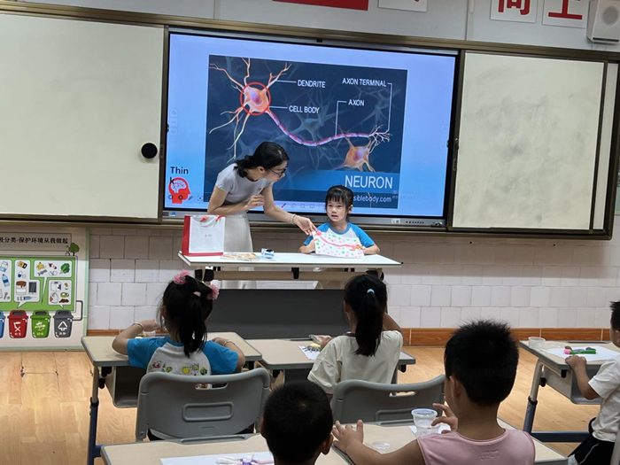 科普讲堂以“大脑细胞之神经元的奥秘”为主题。幼儿园中六班小朋友在支部党员赵文婧同志的带领下,首先了解神经元的基本形态结构特征和神经元之间建立联系的过程,接着在老师们的指导下,用彩色橡皮泥完成了神经元简易模型的手工制作。党支部书记葛盈盈同志带领小朋友们进行了神经元知识抢答和自制模型展示讲解。林永达同志和李肇天同志参与了互动和实践环节的辅导工作。活动采用BOPPPS教学法,各环节充分融入参与式教学活动,有效点燃了孩子们的学习热情,现场氛围热烈,孩子们在这场寓教于乐的科普活动中收获了知识和快乐。