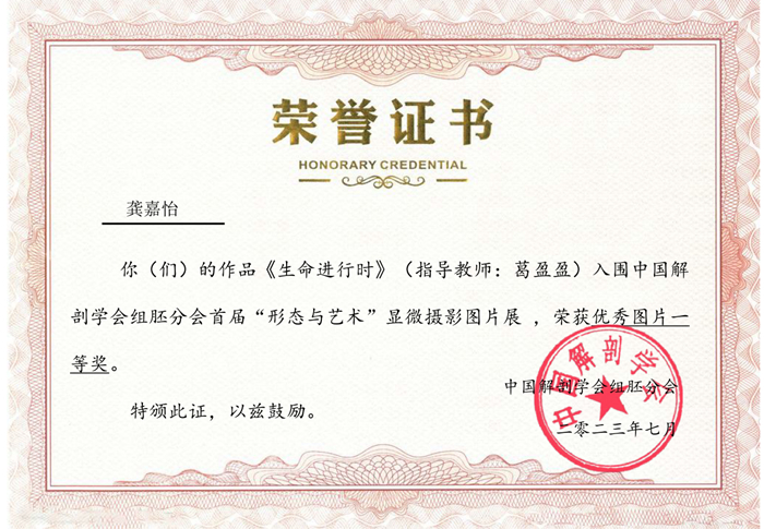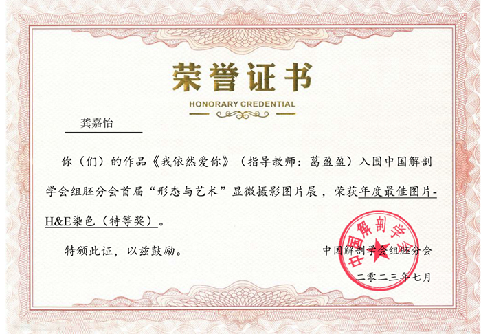 近日,首届中国解剖学会组织学与胚胎学分会“形态与艺术”显微摄影图片比赛结束,我校组织学与胚胎学教研室葛盈盈老师指导、2022级临床医学(5+3)1班龚嘉怡同学的两幅作品《我依然爱你》与《生命进行时》分别获得“年度最佳图片H&E染色特等奖”和“优秀图片一等奖”。