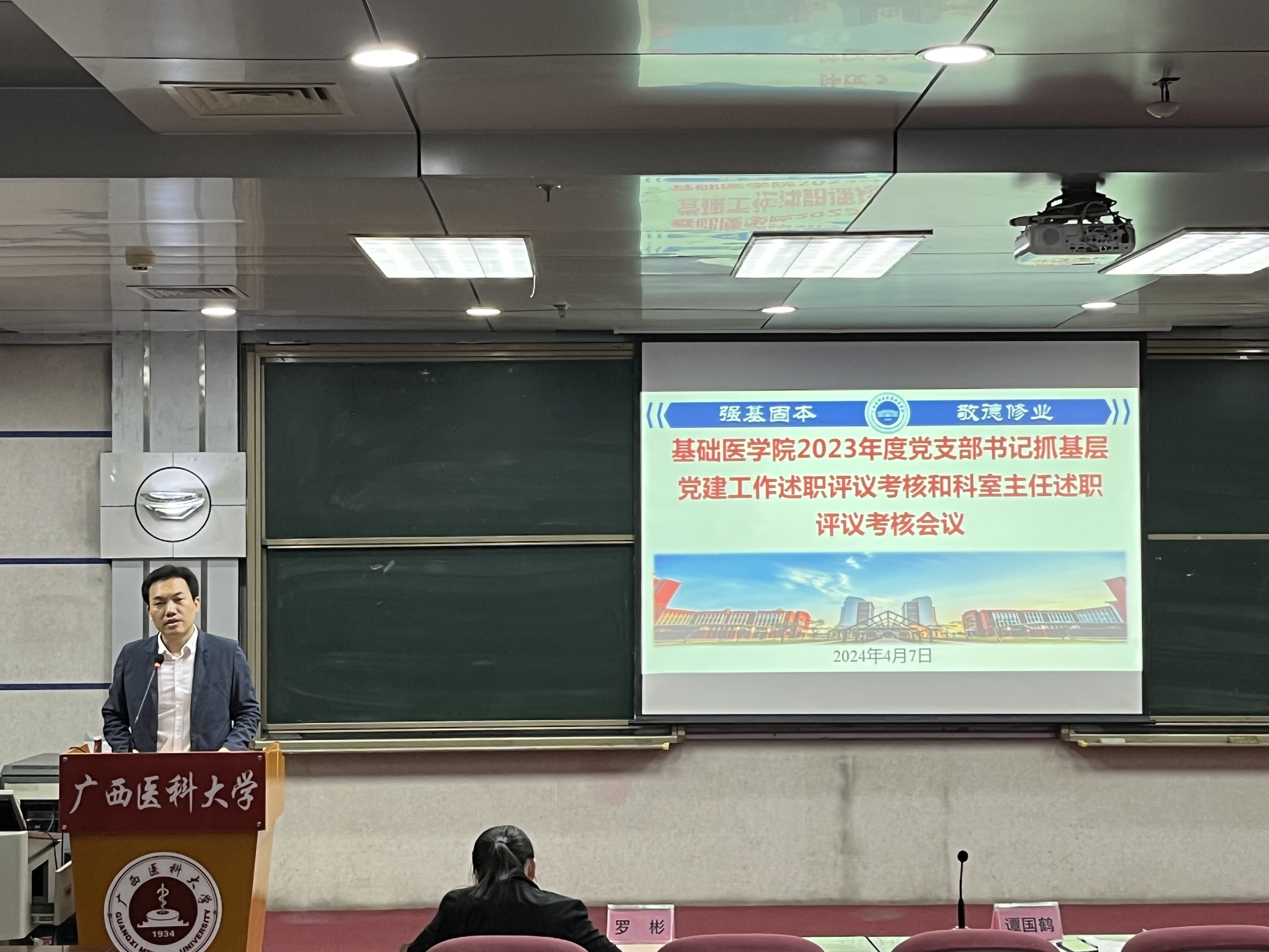 4月7日上午,基础医学院在综合楼一楼报告厅召开2023年度党支部书记抓基层党建工作述职评议考核和科室主任述职评议考核会议。学院党委书记谭国鹤、党委副书记李文奇、副院长罗彬、蓝秀万,各党支部、各科室相关负责人参加会议。会议由李文奇副书记主持。