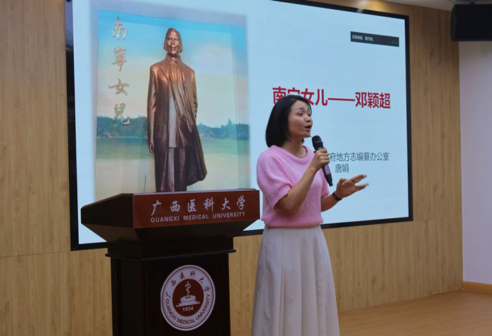 唐娟主任以《南宁女儿——邓颖超》为题,讲述了党和国家的卓越领导人、中国妇女运动的先驱者——邓颖超同志在童年、青年的成长故事以及与周恩来的伉俪情深。邓颖超1904年出生于南宁市邕江边,并在南宁度过了难忘的童年时光。从五四运动开始,邓颖超为中国人民的解放事业、社会主义建设和改革开放事业,特别是为中国妇女的解放运动,建立了不朽的功勋。她是中华民族的优秀女儿,是南宁人民的骄傲。