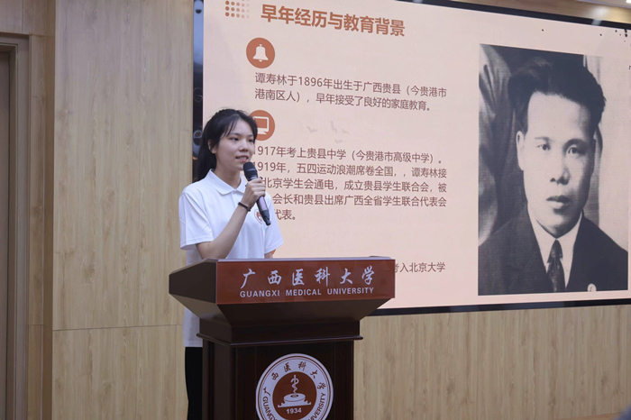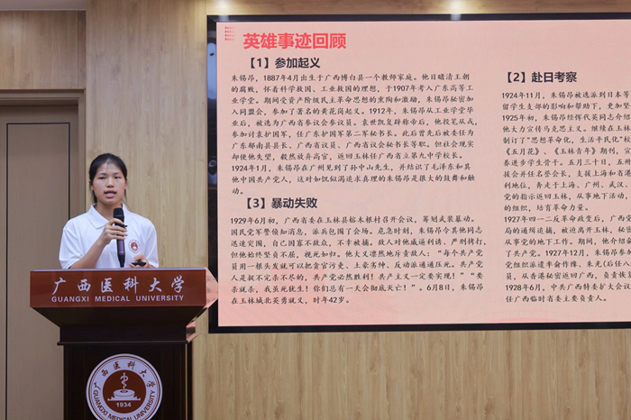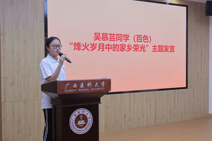 活动现场,梁甜副馆长向基础医学院捐赠《“天津支边医生在广西”史料选编》书籍。2301班学生吴慕芸、姜少玉、梁兰凤作“烽火岁月中的家乡荣光”主题发言,分享了邓小平、谭寿林、朱锡昂等革命先辈故事。全体师生还集中观看了2024广西新民歌大会第一季《山河已无恙+国家》,并通过合唱歌曲《国家》,唱响新时代青年的青春誓言。