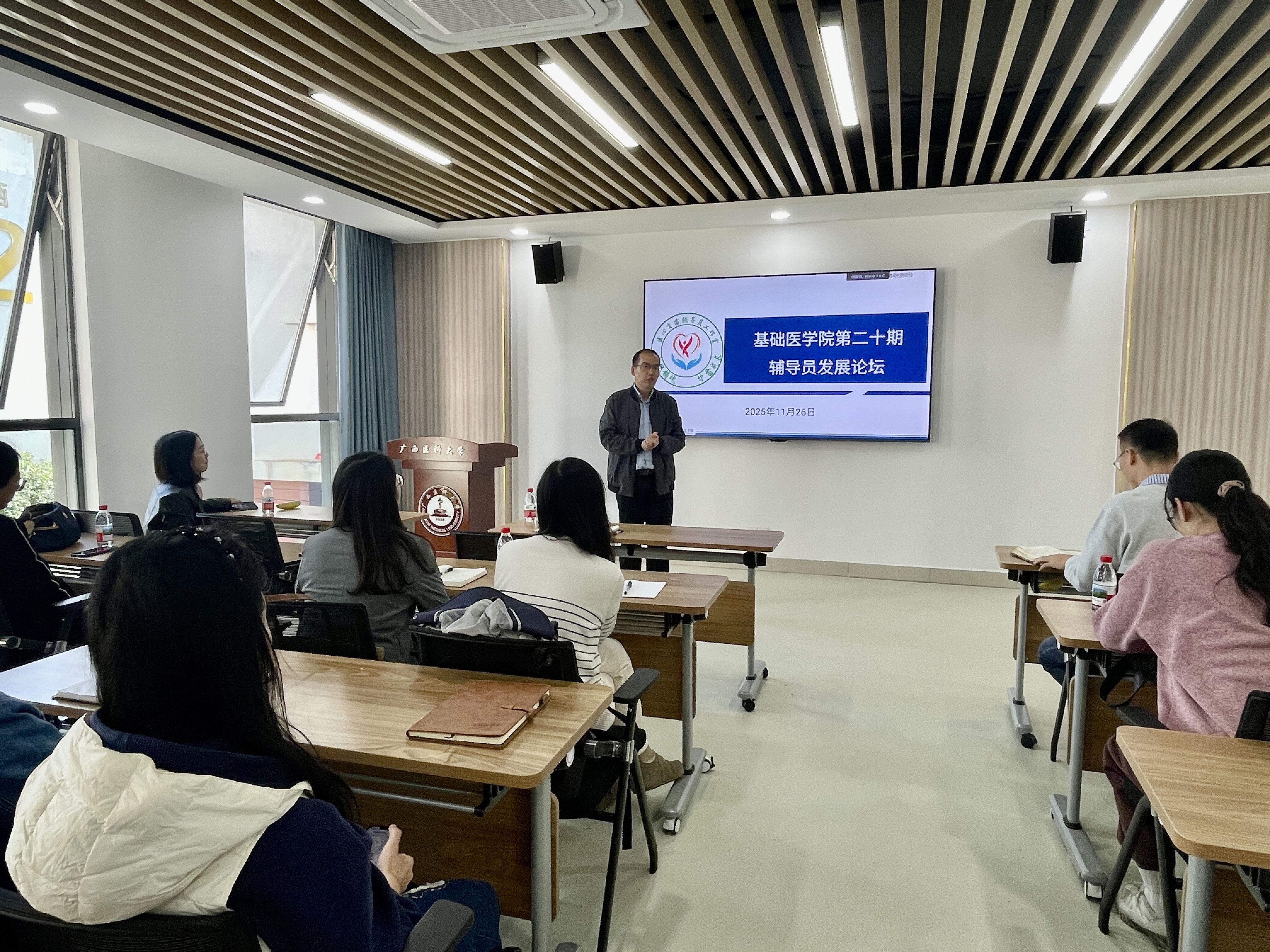 11月26日上午,基础医学院第二十期辅导员发展论坛在武鸣校区西区榕园学生之家三楼顺利举行。论坛由学院党委副书记王闻楚主持,全体专职辅导员参加。
