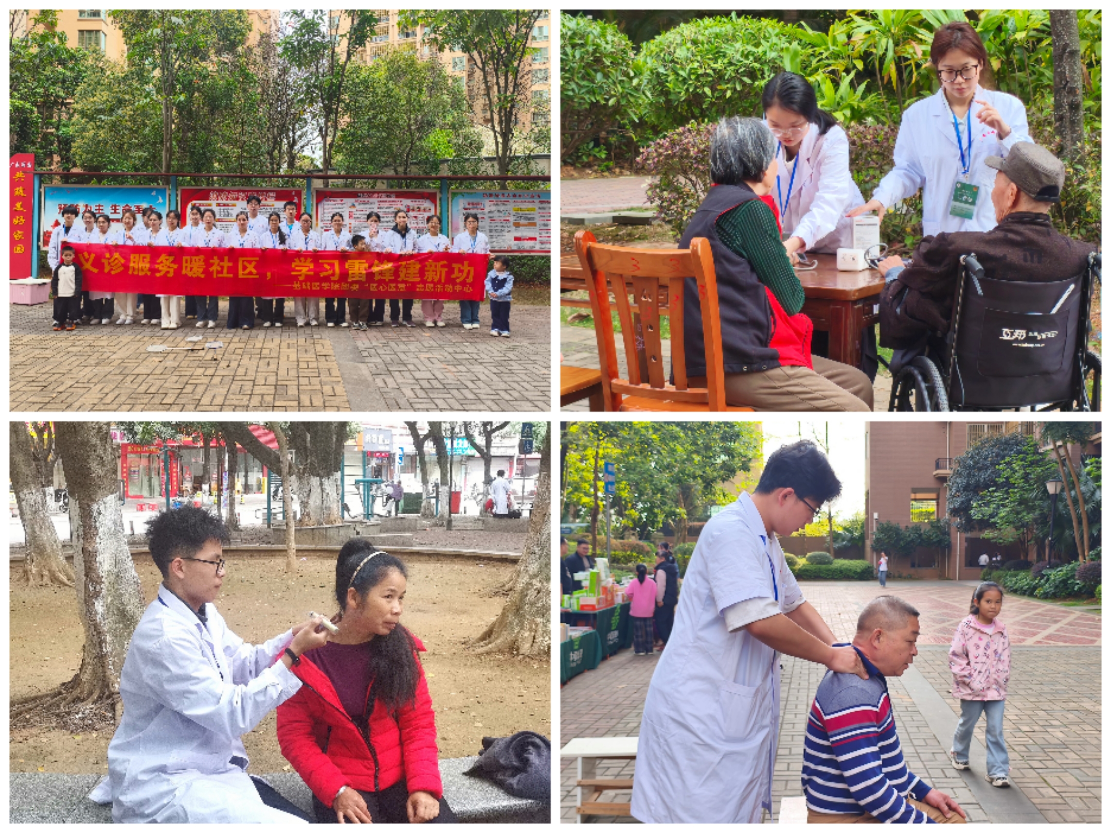 走出校园,学院团委组织开展“义诊服务暖社区,学习雷锋建新功”主题活动,组织志愿者近200人先后走进广泰丽园小区、新兴社区,为居民提供量血压、艾灸、按摩以及健康咨询等便民服务,让居民在家门口享受健康服务,有效增强了居民的健康意识,营造了互助友爱的社区氛围,累计服务群众达700余人次。
